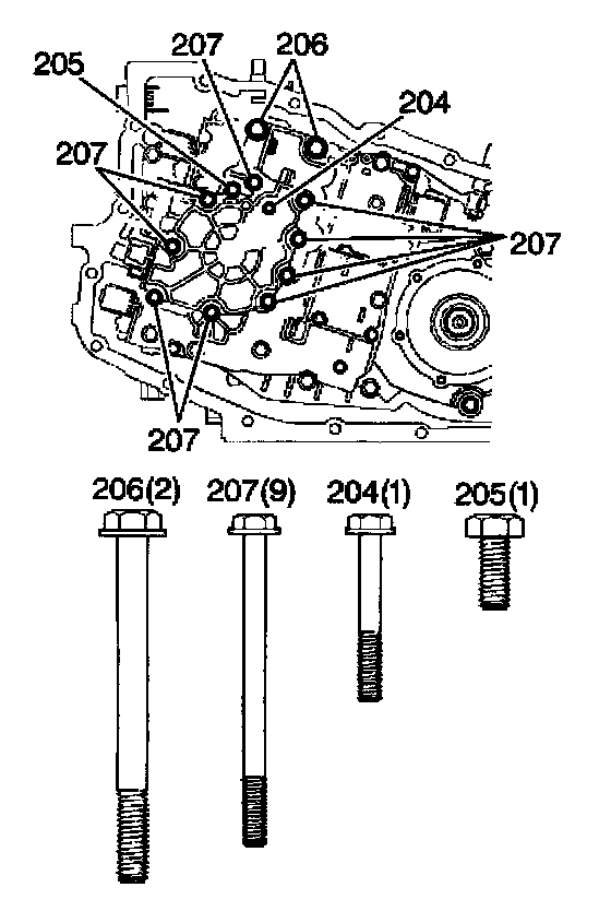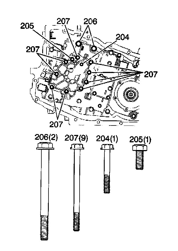 2. Install the oil pump bolts (204-207).