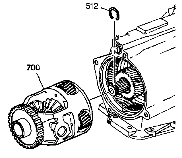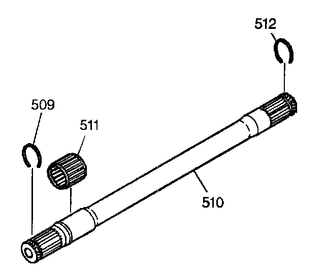 1. Install the drive axle retaining ring (509) and the output shaft differential inboard snap ring (512) onto the output shaft (510).