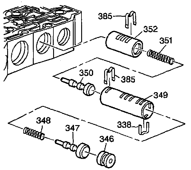 4. Insert the 1-2 accumulator valve (341) and the spring (340) into the 1-2 accumulator bushing (342).
