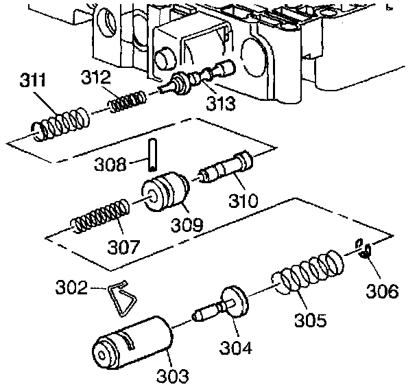 35. Install the spring (305), the line boost valve (304), and the bore plug (303) into the valve body.