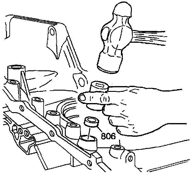 6. Use a mallet in order to install the actuator guide pin (808).