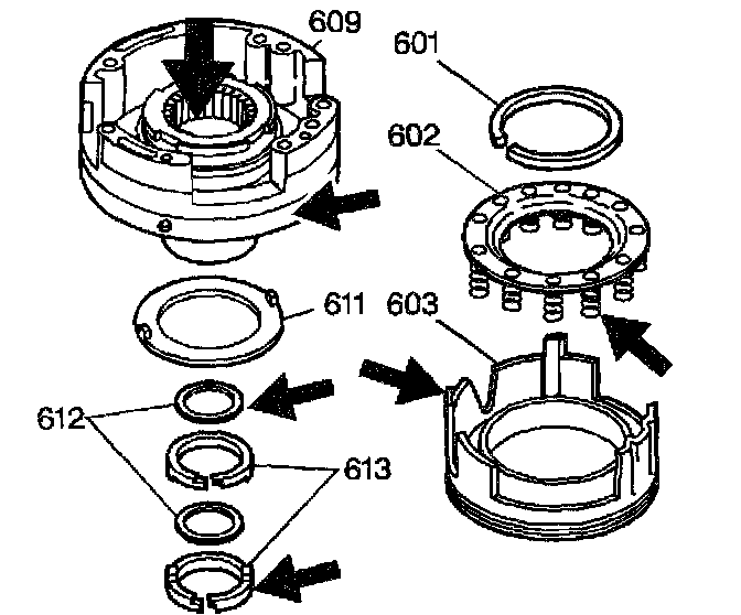 4. Inspect the fourth clutch spring assembly (602) for distorted or missing springs.