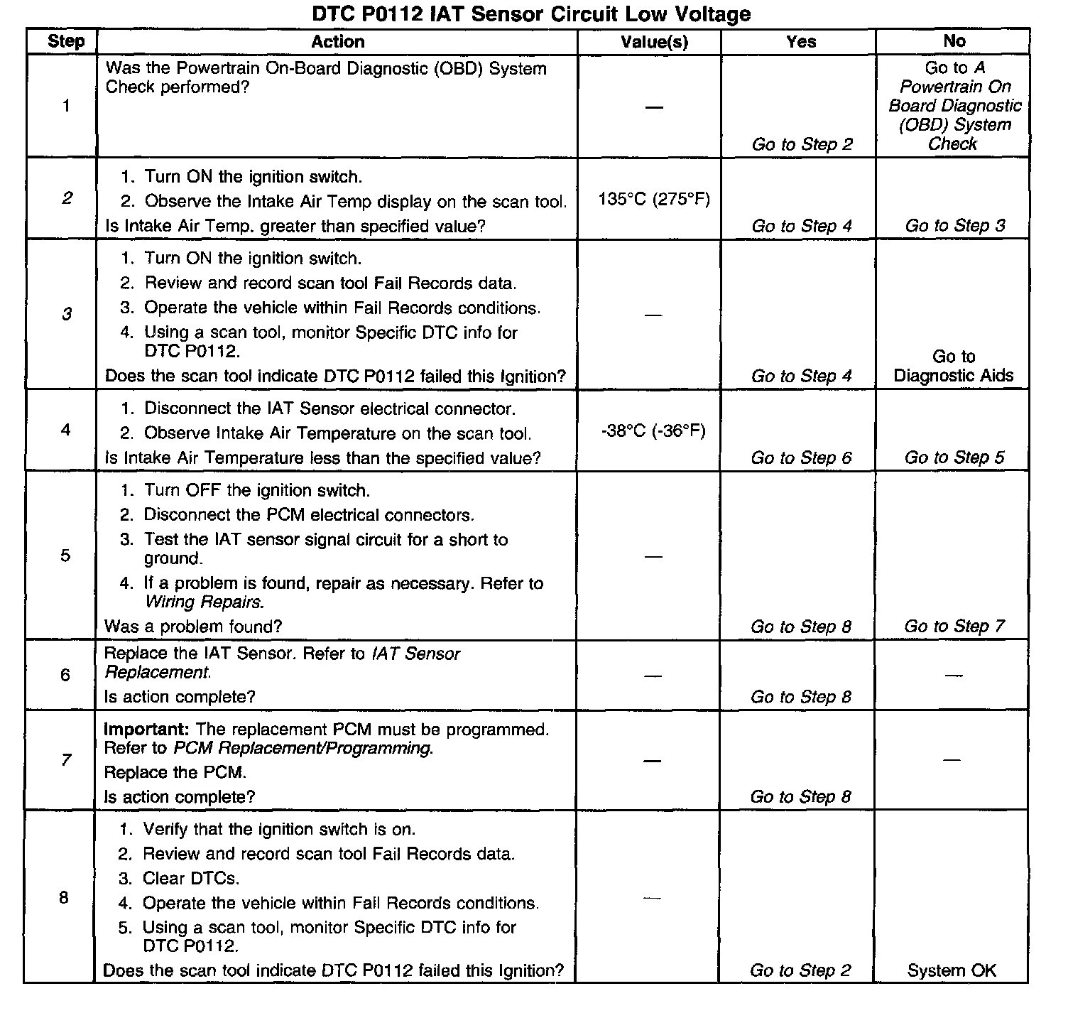 3. If DTC P0112 can be repeated only by duplicating the Fail Records conditions. The table may be used to test the IAT sensor at various temperatures to evaluate the possibility of a shifted sensor that may be shorted above or below a certain temperature. If this is the case, replace the IAT sensor.