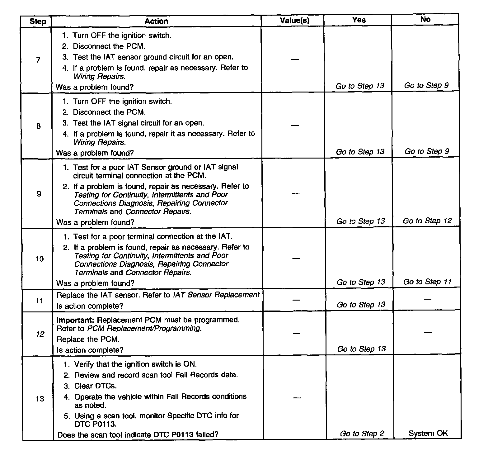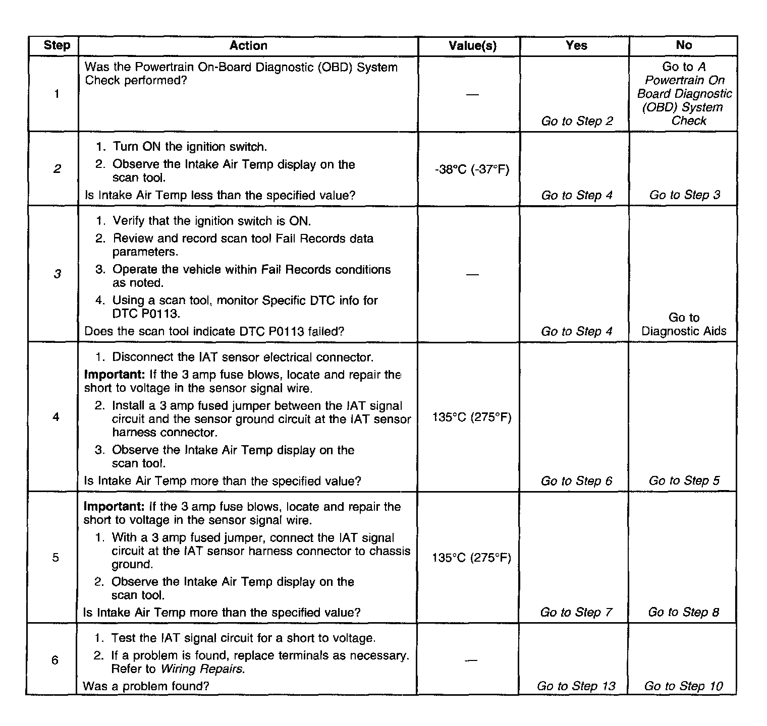 3. If DTC P0113 can be repeated only by duplicating the Fail Records conditions. The table may be used to test the IAT sensor at various temperatures to evaluate the possibility of a shifted sensor that may be open above or below a certain temperature. If this is the case, replace the IAT sensor. If the IAT sensor appears to be OK, the malfunction is intermittent; refer to Diagnostic Aids.