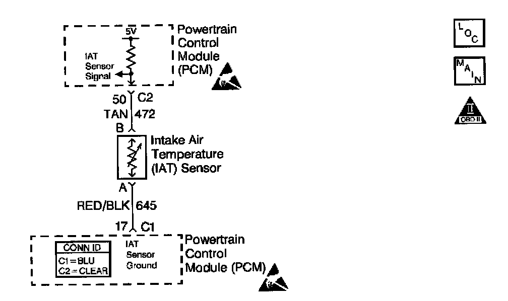 The Intake Air Temperature (IAT) sensor is a thermistor which measures the temperature of the air entering the engine. The PCM applies 5 volts through a pull-up resistor to the IAT sensor. When the intake air is cold, the sensor resistance is high and the PCM will monitor a high signal voltage on the IAT signal circuit. If the intake air is warm, the sensor resistance is lower causing the PCM to monitor a lower voltage. DTC P0113 will set when the PCM detects an excessively high signal voltage on the intake air temperature sensor signal circuit.