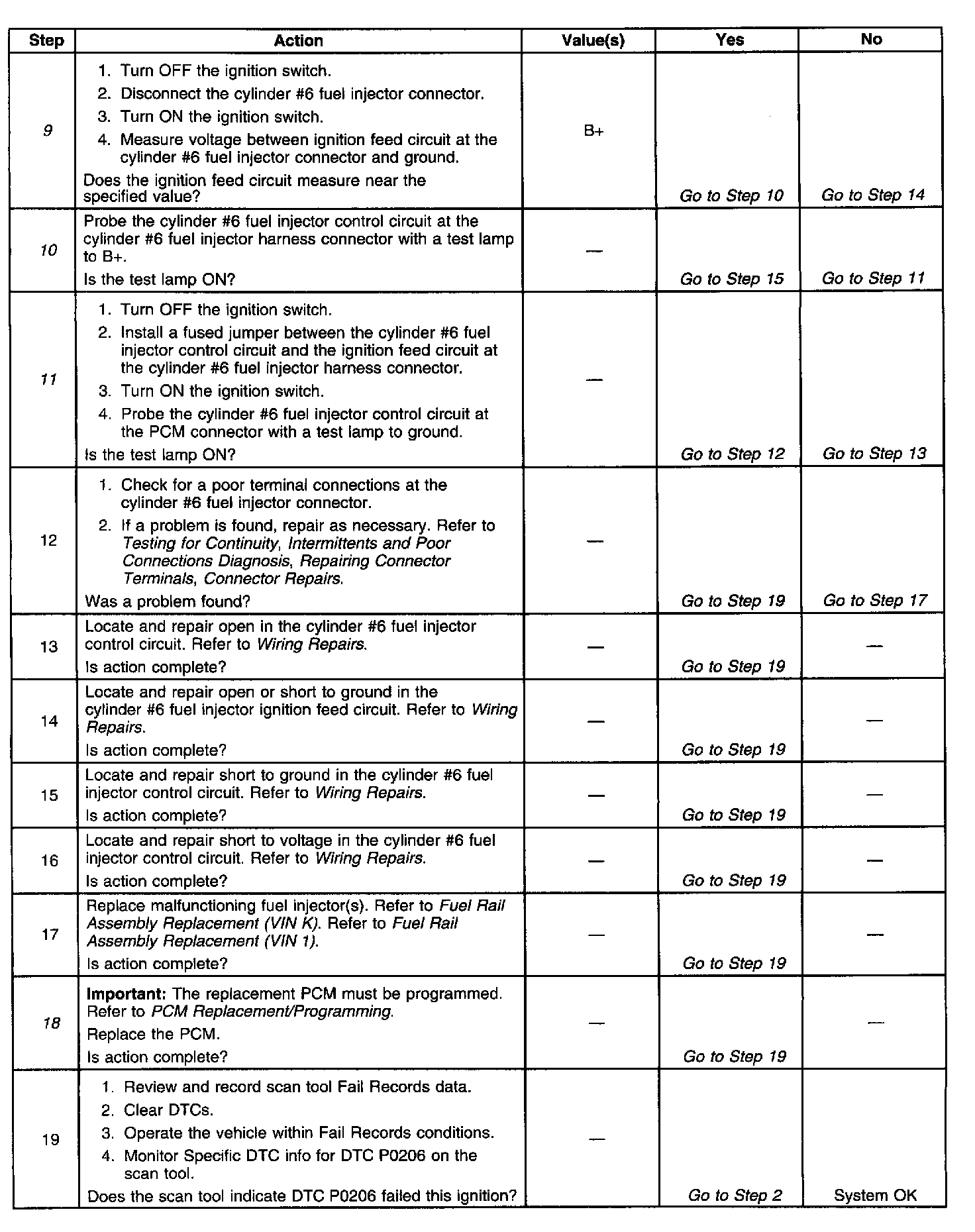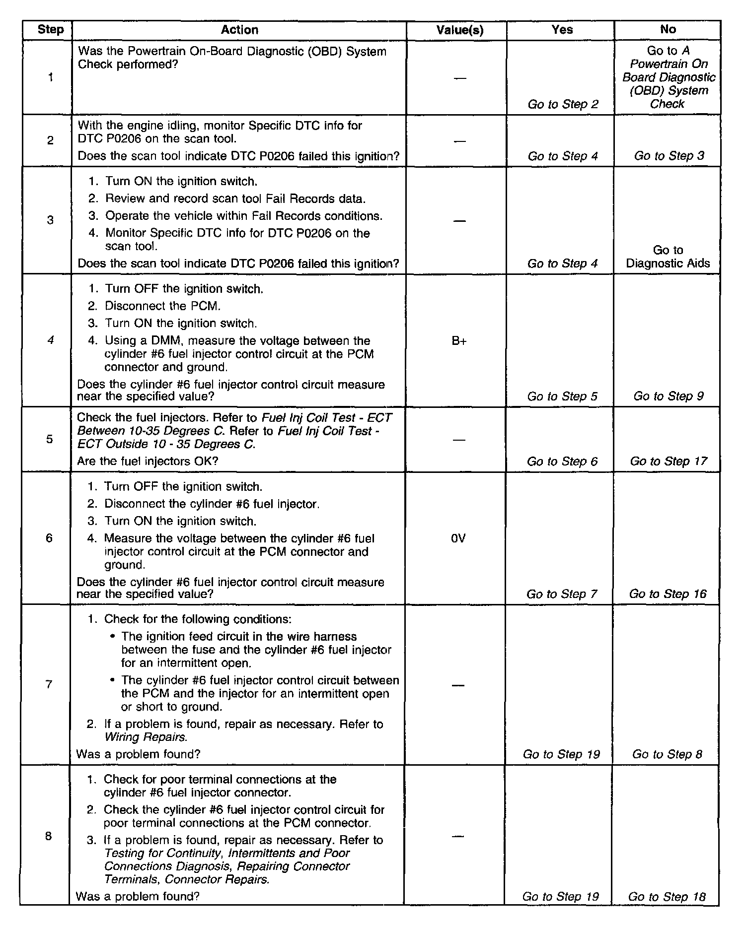 The PCM controls the fuel injectors by using an ignition feed and ground driver circuit within the PCM. The driver has the ability to detect an electrical malfunction in the ignition feed or ground circuit. It an electrical malfunction occurs in the fuel injector circuit for engine cylinder #6, the ignition feed driver signals the PCM to set DTC P0206.