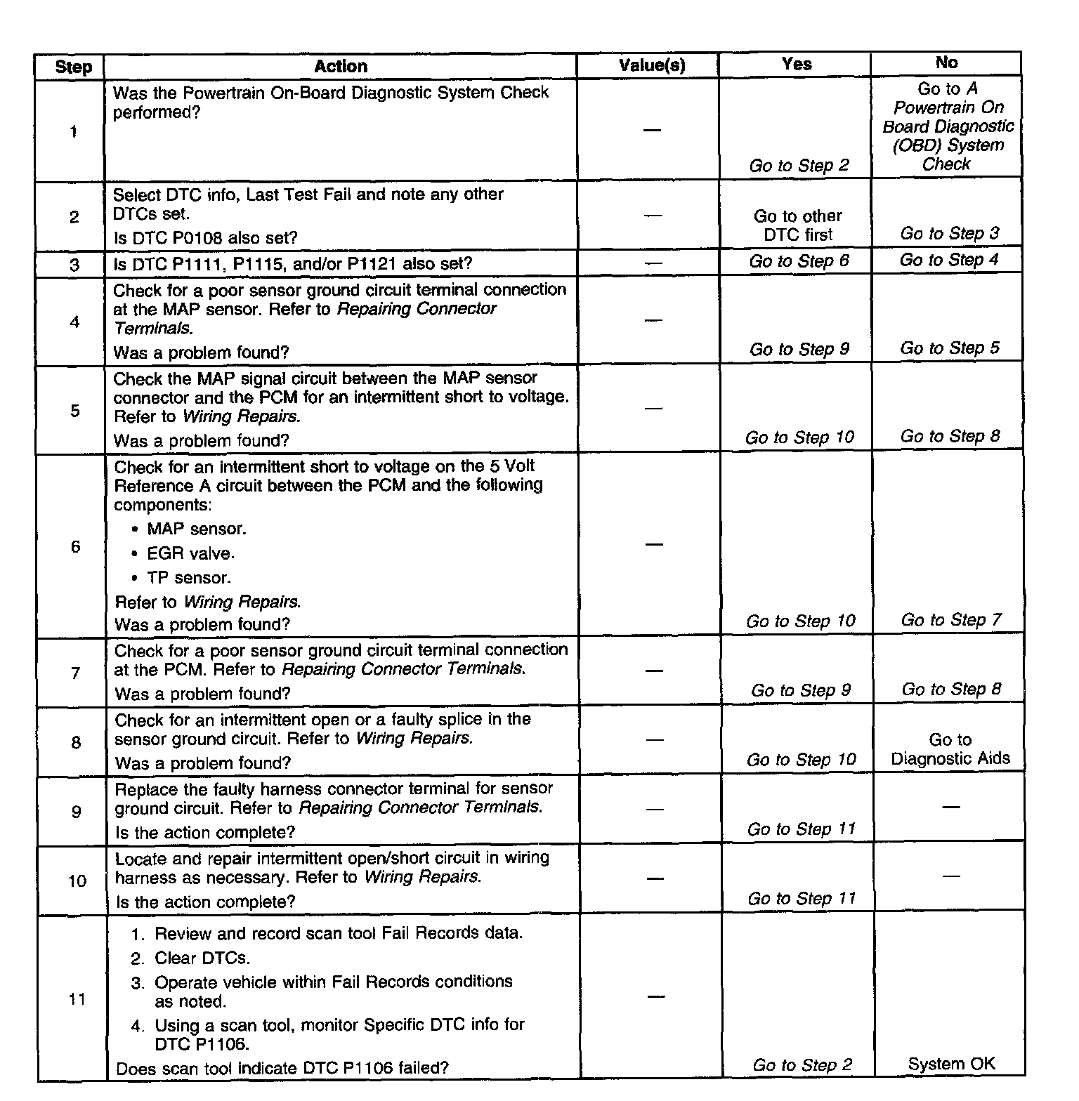 The Manifold Absolute Pressure (MAP) sensor responds to changes in intake manifold pressure. The PCM supplies a 5 volt reference and a ground for the MAP sensor. The MAP sensor circuit provides a signal to the PCM relative to pressure changes in the manifold. With the key ON, engine not running, the MAP sensor signal voltage to the PCM varies between 1.5 to 2.5 volts. With the engine running, the MAP sensor voltage to the PCM varies from below 2 volts at idle (low manifold absolute pressure - high vacuum) to above 4 volts at wide-open throttle (high manifold absolute pressure - low vacuum). The PCM monitors the MAP signals for voltages outside the normal range of the MAP sensor. If the PCM detects a MAP signal voltage that is intermittently high, DTC P1106 will be set.
