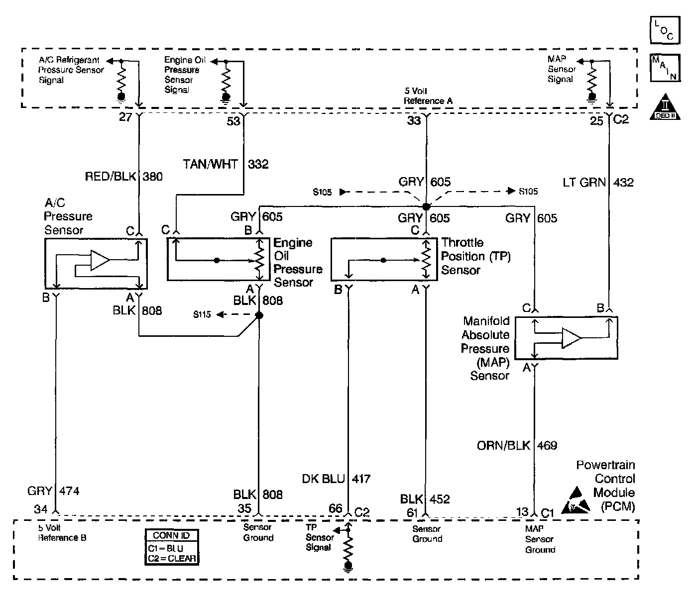 Depending on where the MAP sensor voltage (high voltage or low voltage) is when the engine is started, the high or low voltage MAP sensor DTCs will set.
