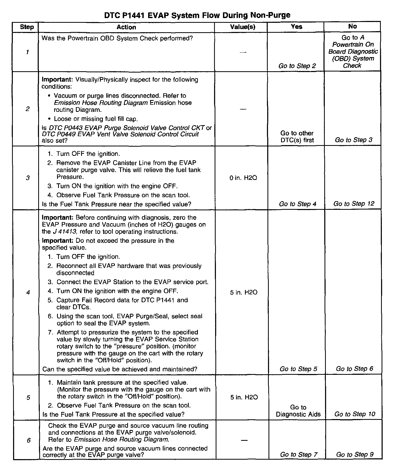 ^ If the harness appears to be OK, connect the J41413 to the EVAP service port, pressurize the EVAP system to 10 in. H2O and observe the Fuel Tank Pressure display on the scan tool while moving connectors and wiring harnesses related to the EVAP purge valve. A sudden change in the display will indicate the location of the malfunction.