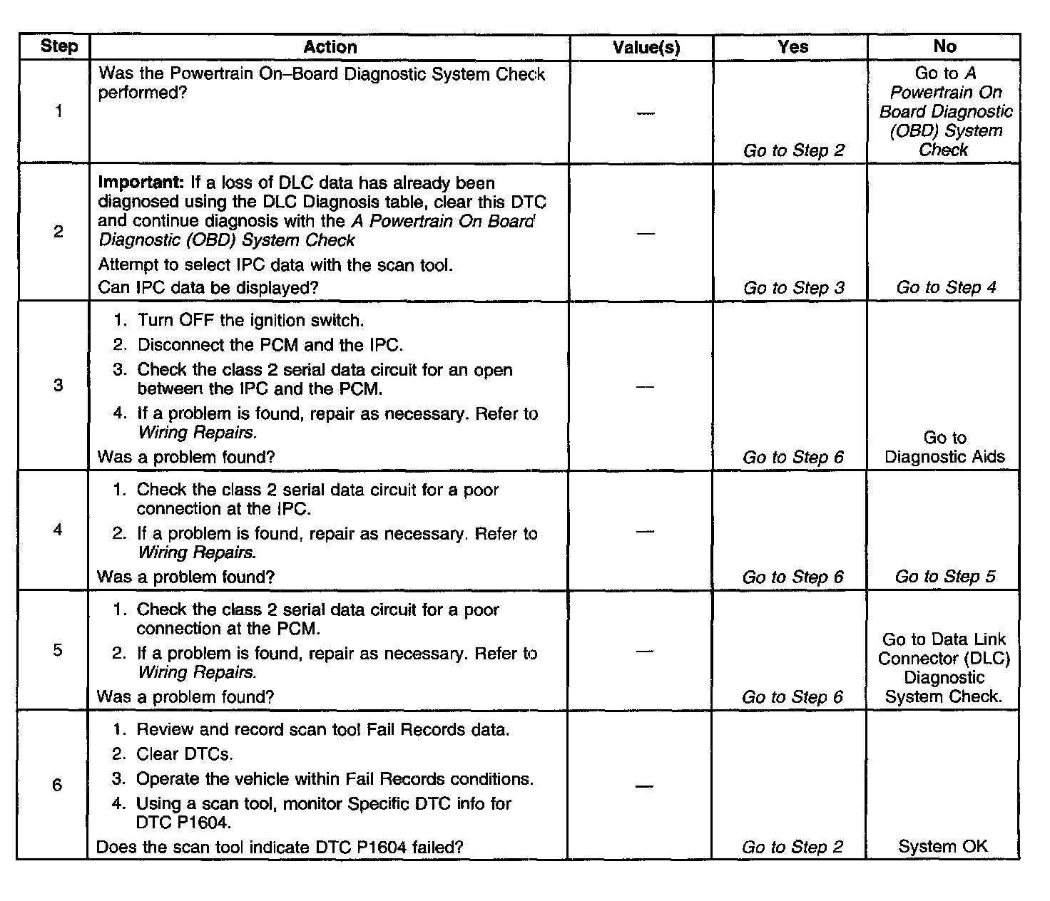 The PCM uses the class 2 serial data circuit to communicate with various other devices and systems in the vehicle. The PCM ensures that communication remains established by monitoring the class 2 serial data circuit for state of health messages from the other devices using the circuit. If the PCM detects a loss of the state of health serial data message from the Instrument Panel Cluster (IPC), DTC P1604 will be set.