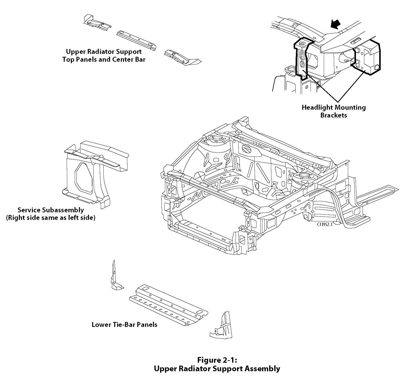 There are two service assemblies, each made up from three of the nine upper panels (figure 2-1). There are no factory welds along the rear edge of these assemblies. The rear edge of these assemblies sandwich the front edge of the wheelhouse apron. After positioning the rest of the radiator support components, check the fit using three dimensional measuring equipment. Plug weld all the panels accordingly, including the rear edge of the assemblies to the wheelhouse apron.