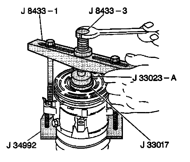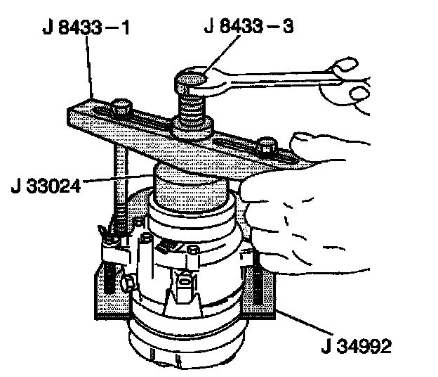 16. Tighten the J 8433-3 in the J 8433 - 1 in order to force the pulley rotor and bearing assembly onto the front head of the compressor.