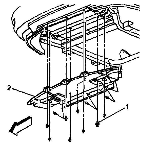 5. Remove the push pins (1) from the lower air deflector (2).
