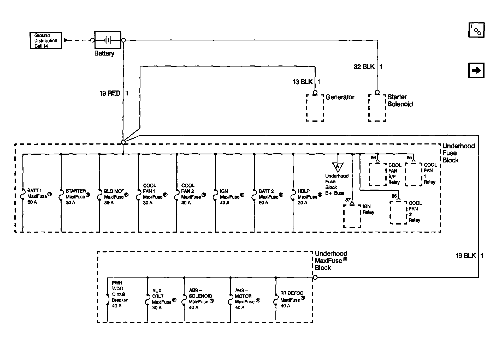 BATT 1, THFT, BLO MOT, COOL FAN1, IGN, BATT 2, HDLP, AUX, RAP, ABS Solenoid, ABB Motor RUN Fuses: