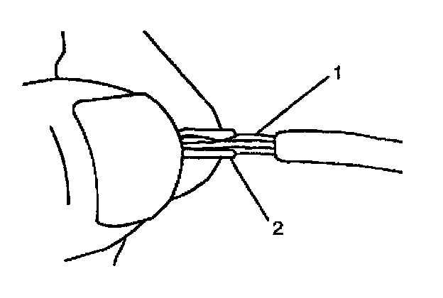 7. Center the splice clip (2) over the stripped wires (1) and hold the clip in place.