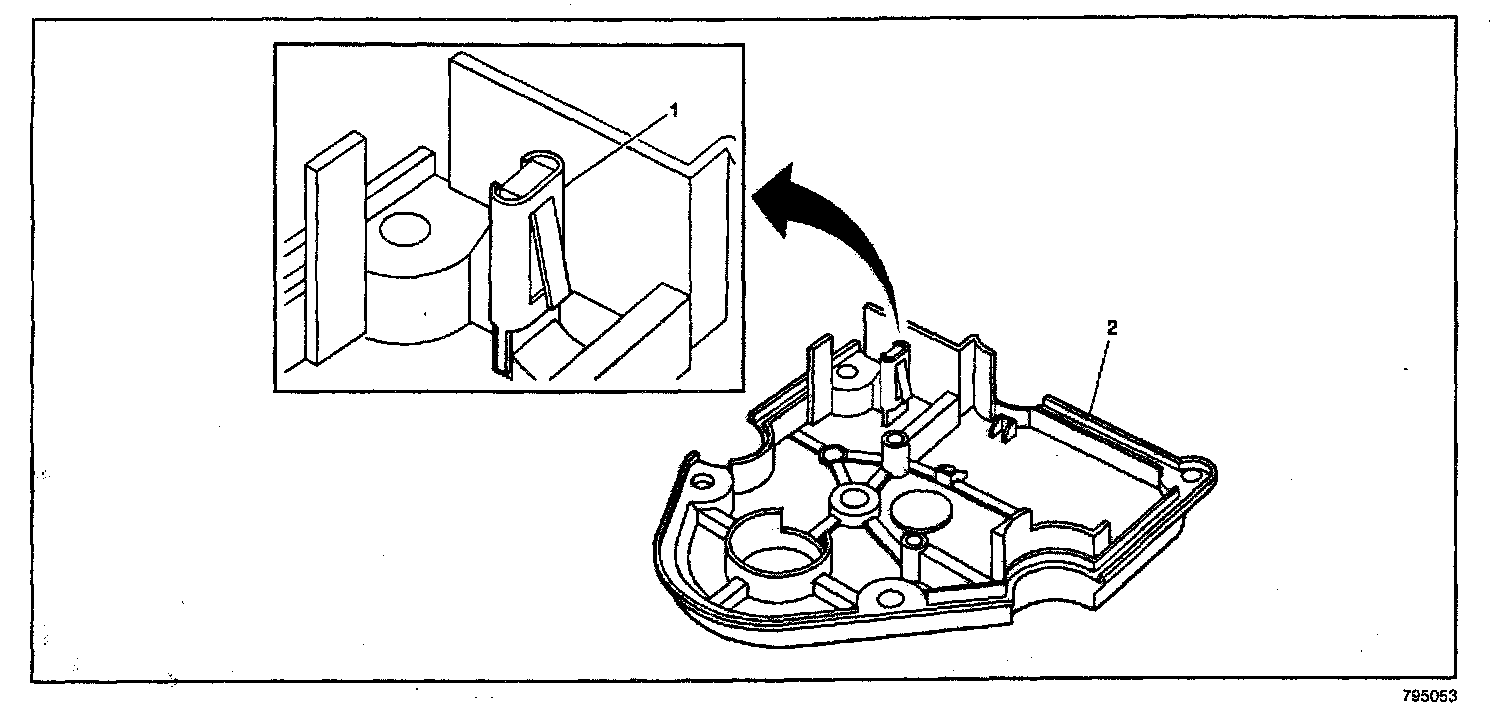3. Install a deflector spring (1), P/N 25732764, on the covers (2) of the actuators. Apply excess lubricant from inside the actuator onto the deflector spring.