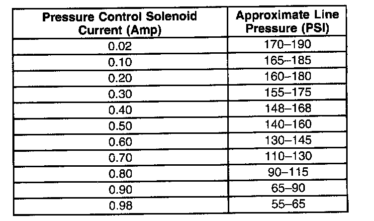 Before performing a line pressure check, verify that the Pressure Control (PC) solenoid valve is receiving the correct electrical signal from the PCM: