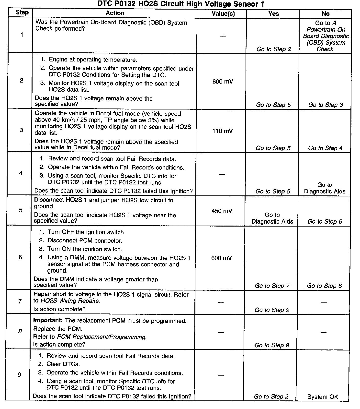 The PCM supplies a bias voltage of about 450mV between the HO2S signal and low circuits. When measured with a 10 megohm digital voltmeter, this may display as low as 320mV. The oxygen sensor varies the voltage within a range of about 1000mV when the exhaust is rich, down through about 1omV when exhaust is lean. The PCM constantly monitors the HO2S signal during closed loop operation and compensates for a rich or lean condition by decreasing or increasing injector pulse width as necessary. If the HO2S 1 voltage remains excessively high for an extended period of time, DTC P0132 will be set.