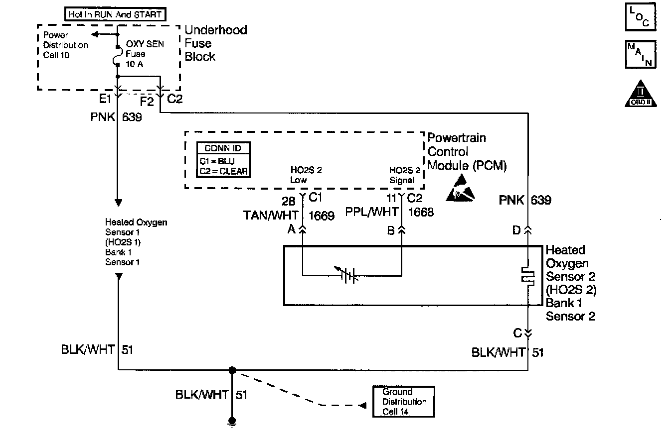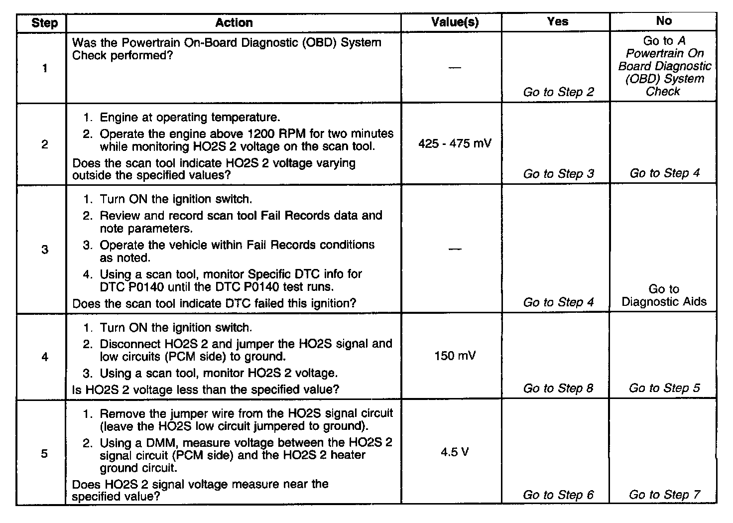 The PCM supplies a bias voltage of about 450 mV between the HO2S signal and low circuits. When measured with a 10 megohm digital voltmeter, this may display as low as 320 mV. The oxygen sensor varies the voltage within a range of about 1000 mV when the exhaust is rich, down through about 10 mV when exhaust is lean. The PCM constantly monitors the HO2S signal during closed loop operation and compensates for a rich or lean condition by decreasing or increasing injector pulse width as necessary. If the HO2S 2 voltage remains at or near the 450 mV bias for an extended period of time, DTC P0140 will be set, indicating an open sensor signal or sensor low circuit.