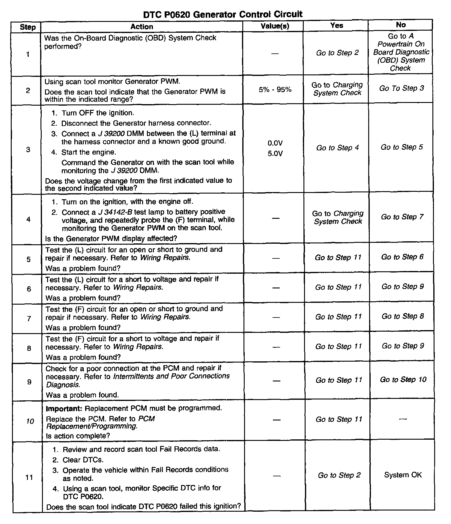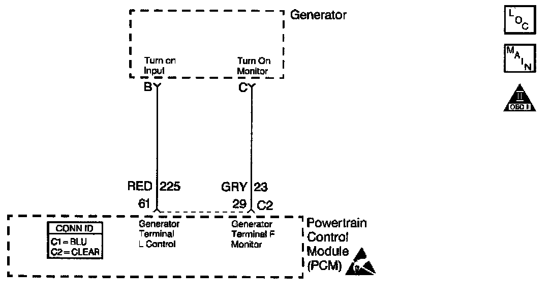 ^ Damaged harness: Inspect the wiring harness for damage. If the harness appears to be OK, disconnect the PCM, turn the ignition on and observe voltmeter connected to the Generator circuit(s) at the PCM harness connector while moving connectors and wiring harnesses related to the Generator control circuit. A change in voltage will indicate the location of the fault. Refer to Intermittents and Poor Connections Diagnosis Connector Repairs and Wiring repairs.
