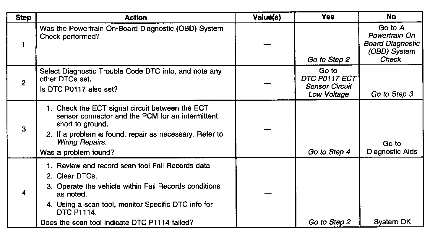 The Engine Coolant Temperature (ECT) sensor is a thermistor mounted in the engine coolant stream. The PCM applies a voltage (about 5.0 volts) through a pull up resistor to the ECT signal circuit. When the engine coolant is cold, the sensor (thermistor) resistance is high, therefore the PCM will measure a high signal voltage. As the engine coolant warms, the sensor resistance becomes less, and the ECT signal voltage measured at the PCM drops. With a fully warmed up engine, the ECT signal voltage should measure about 1.5 to 2.0 volts. If the PCM detects an ECT signal that is intermittently below the range of the ECT sensor, DTC P1114 will set.