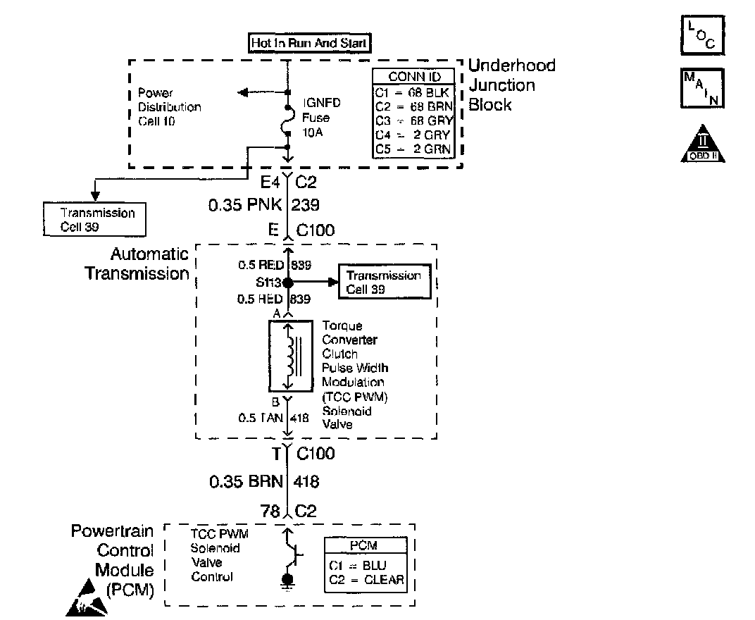 Ignition voltage is provided to the torque convener clutch pulse width modulation (TCC PWM) solenoid valve. The PCM controls the ON and OFF time of the solenoid by providing a ground through the output driver module (ODM) B. The PCM uses a PWM duty cycle in order to control application and release of the Torque Converter Clutch (TCC). When the solenoid is commanded OFF, the PCM senses high voltage. When the solenoid is commanded ON, the PCM senses low voltage.