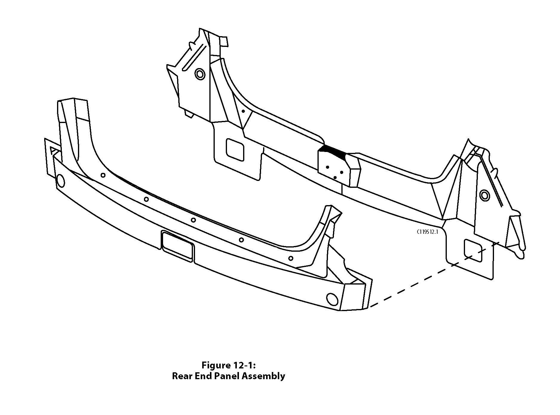 The rear end panel is supplied as a complete assembly. The tail lamp pockets are attached to the quarter panels (figure 12-1).