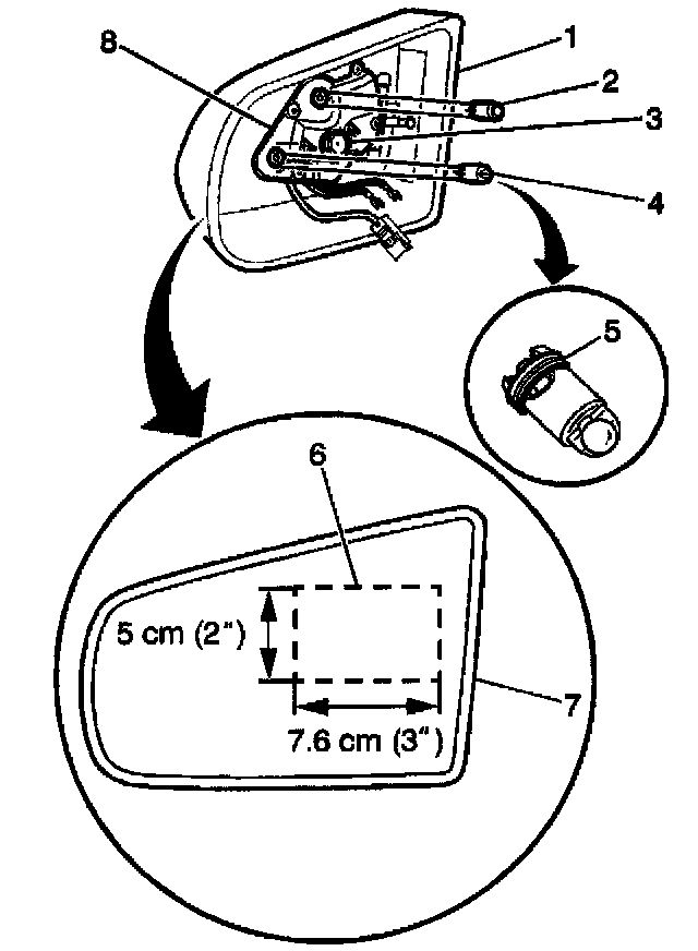 1. Remove the mirror and plastic backing plate (7) by pulling the assembly out of the mirror housing (1).