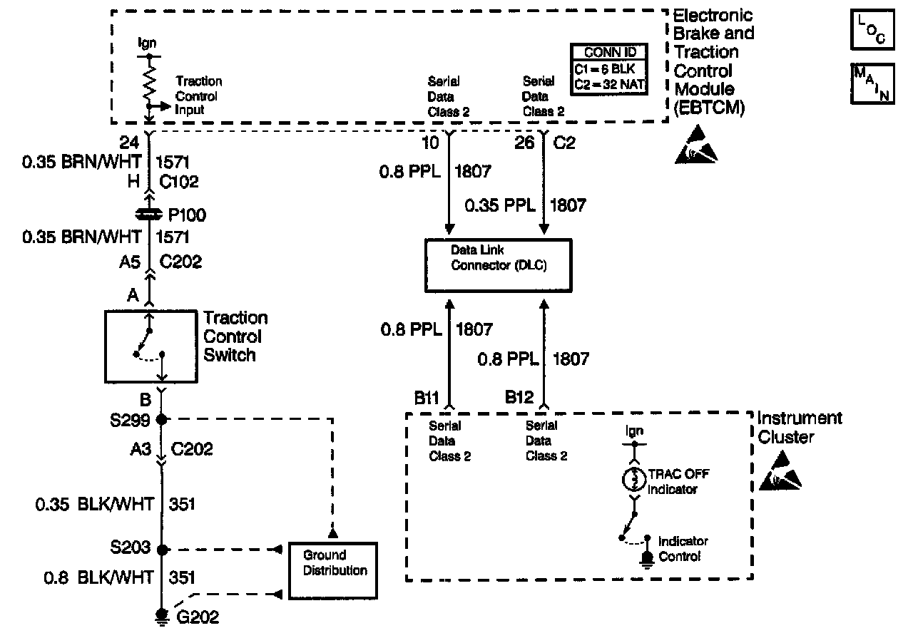 The instrument cluster controls the operation of the TRAC OFF indicator. The EBCM/EBTCM receives a traction control input when the traction control switch is pressed. The EBCM/EBTCM disables the TCS then sends a serial data class 2 message to the instrument cluster to turn the TRAC OFF indicator ON. Each time the ignition switch is cycled from the OFF to the RUN position, the TCS is enabled until the traction control switch is pressed.