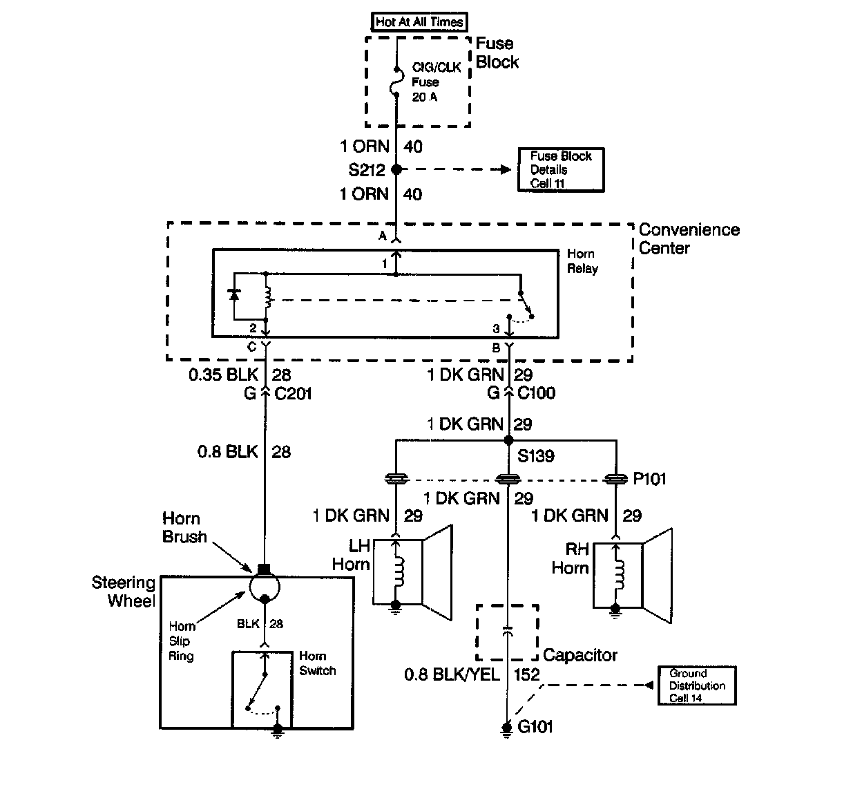 IMPORTANT: The schematic does not represent the components and wiring as they physically appear on the vehicle. For example, a 4-foot length of wire is treated no differently in a schematic from one which is only a few inches long.When diagnosing a horn problem use the service information located in the Horns service category. The following schematic is a typical example of a schematic with its supporting text.