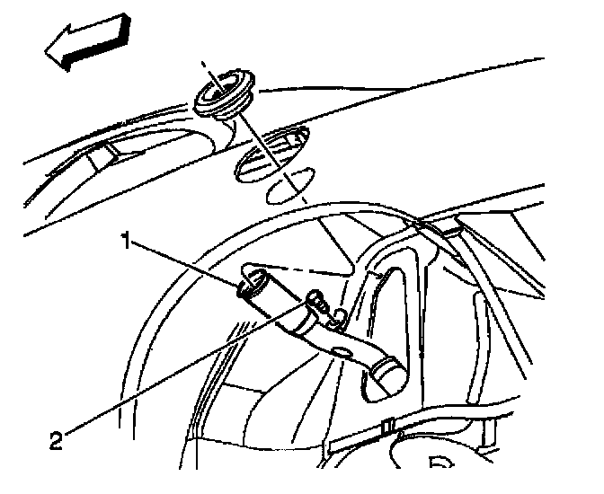 7. Remove the fuel tank filler pipe (1) hose clamps and the fuel tank filler pipe.