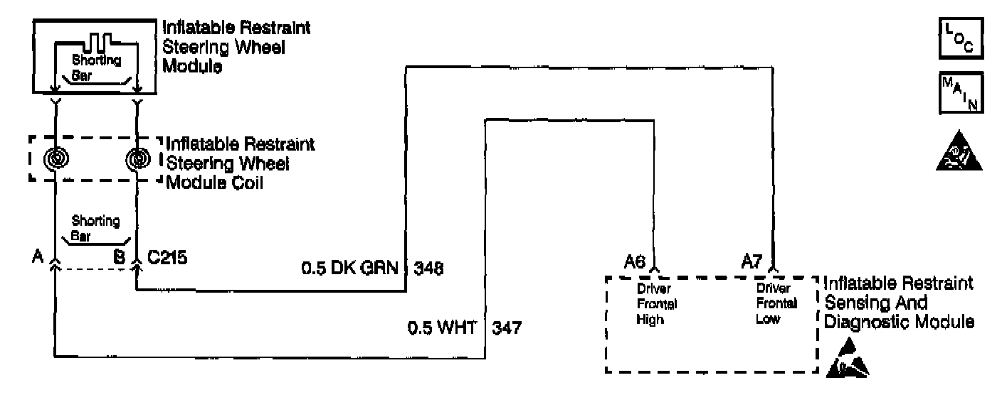 A short to B+ or short to ground in the Inflatable Restraint Steering Wheel Module circuit can cause an intermittent condition. Inspect circuit 347 and circuit 348 carefully for cutting or chafing. Wiring pigtail damage requires replacement of the Inflatable Restraint Steering Wheel Module Coil.