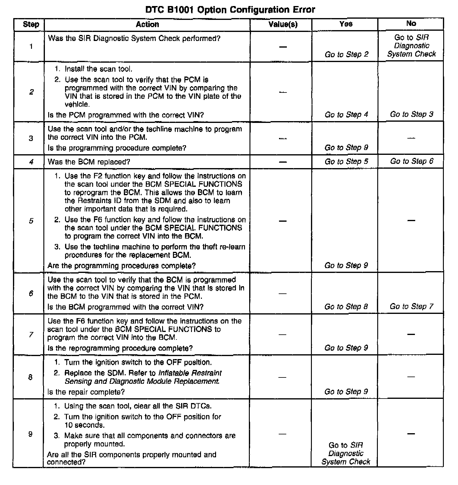 DTC B1001 is an indication that the restraints ID's stored in both the BCM and SDM do not match or that the VIN's stored in both the BCM and SDM do not match. If either the BCM and/or PCM were replaced, the replacement modules need to be reprogrammed for proper operation.