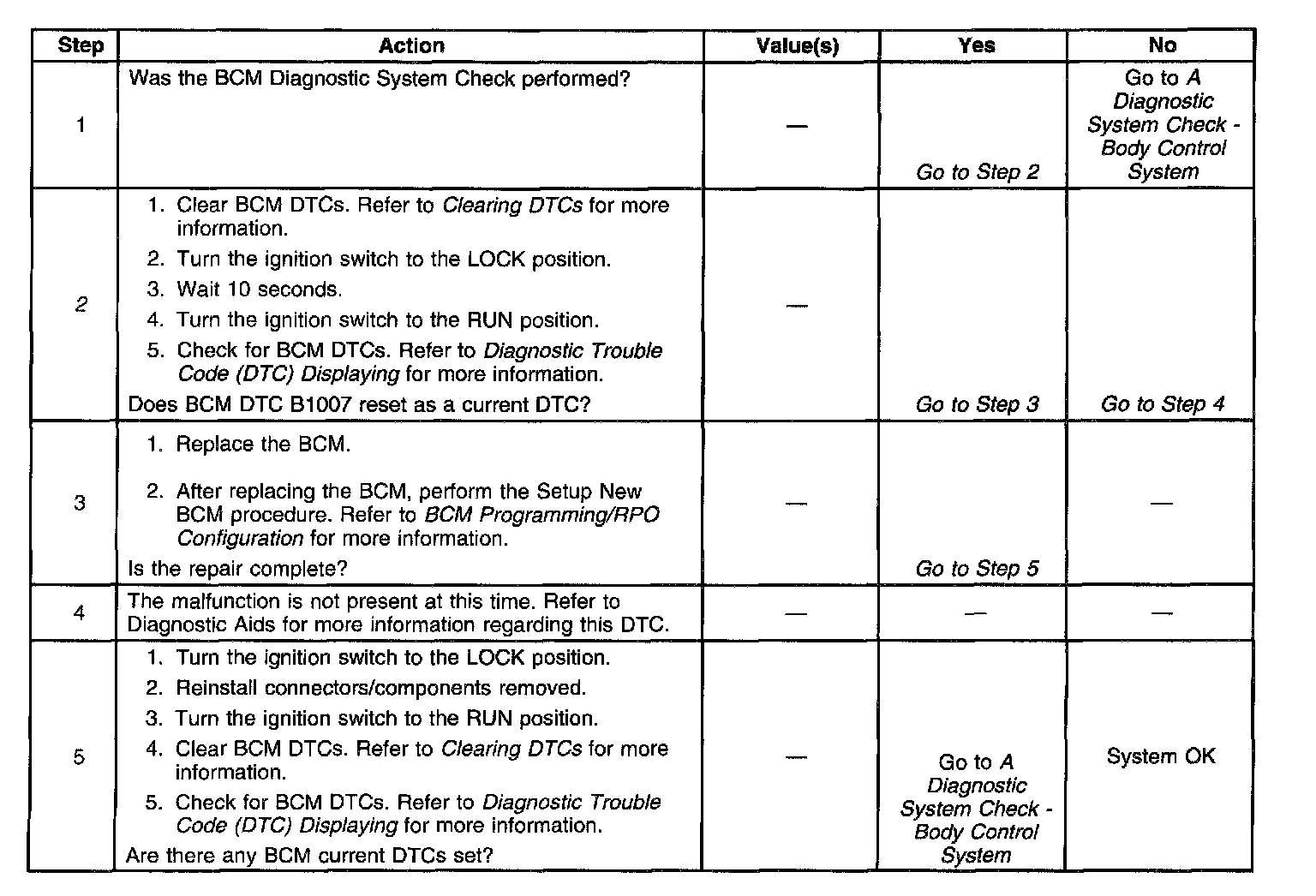 DTC B1007 is related to an internal malfunction of the EEPROM in the BCM. The EEPROM is not removable from the BCM; therefore, replace the BCM. A service replacement BCM must be programmed and configured to the vehicle. Use a scan tool in order to make sure the BCM is properly programmed and configured for the correct Passlock and vehicle option content. Refer to BCM Programming/RPO Configuration for more information. Service and Repair