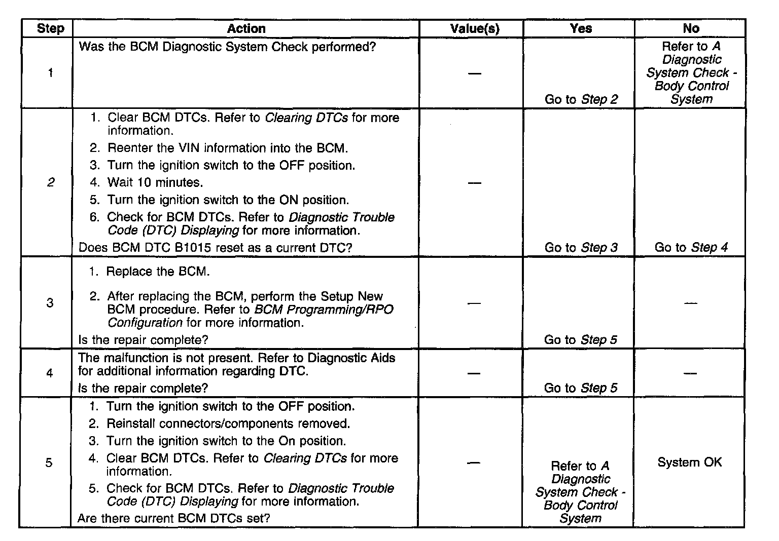 DTC B1015 is related to an internal VIN error in the BCM. The VIN information is not removable from the BCM; therefore, try reentering the VIN information and if it is still incorrect, replace the BCM. A service replacement BCM must be programed and configured to the vehicle. Use the scan tool in order to make sure the BCM is properly programmed and configured to the vehicle. Use the scan tool in order to make sure the BCM is properly programmed and configured for the correct Passlock and vehicle option content. Refer to BCM Programming/RPO Configuration for more information. Service and Repair