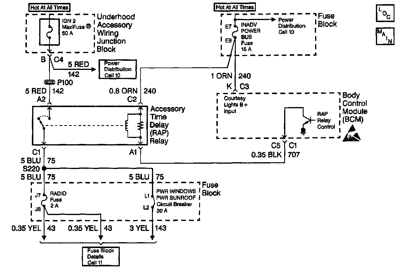 When the ignition switch is in either the ACC or the RUN position, the BCM energizes the RAP relay by grounding circuit 707.