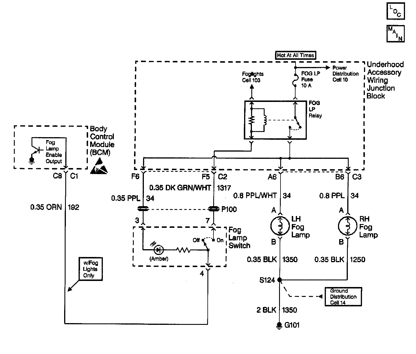 When the ignition switch is on, the BCM provides a ground feed to the fog lamp switch through circuit 192. Turning the fog lamp switch to the ON position sends a ground signal from circuit 192 to circuit 1317, enabling the FOG LP relay.