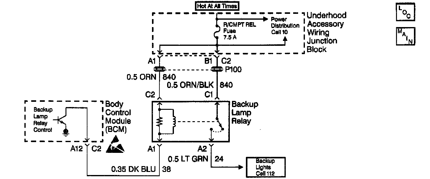 - The backup lamp relay coil is shorted to B+ internally.