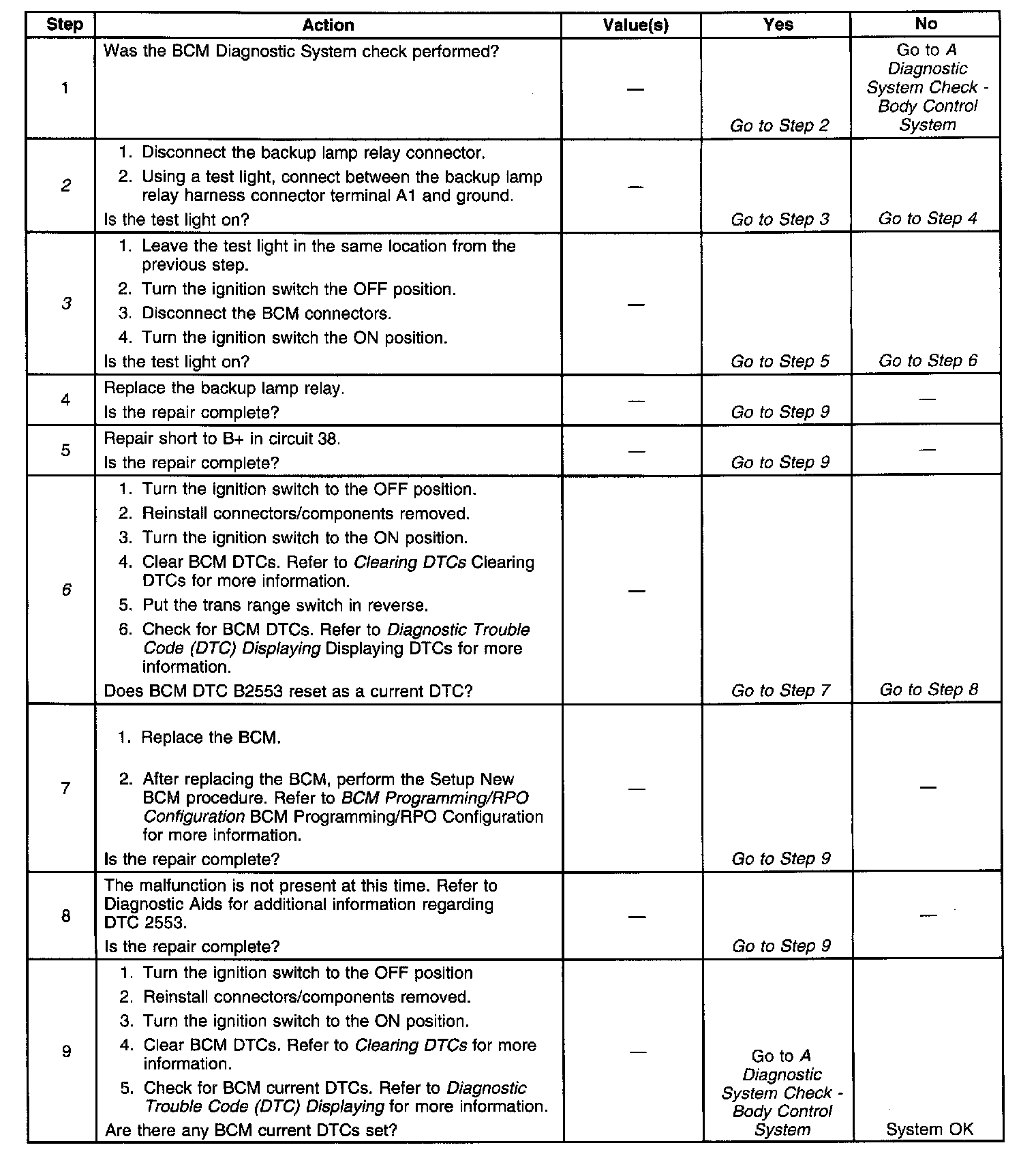 6. This step checks BCM DTC B2553 and checks for BCM DTC B2553 to set again.