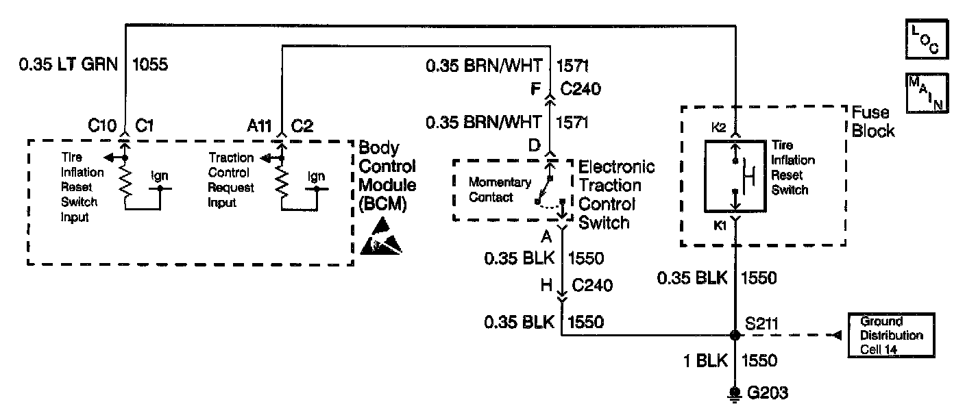 The BCM receives a momentary ground signal from the Tire Inflation Reset Switch when the tires are inflated to the right amount and the customer presses the reset switch (located in the fuse block). The BCM then will send a class (D) message to the IP to turn off the LOW TIRE PRESSURE Indicator and reset the Low Tire Pressure system.