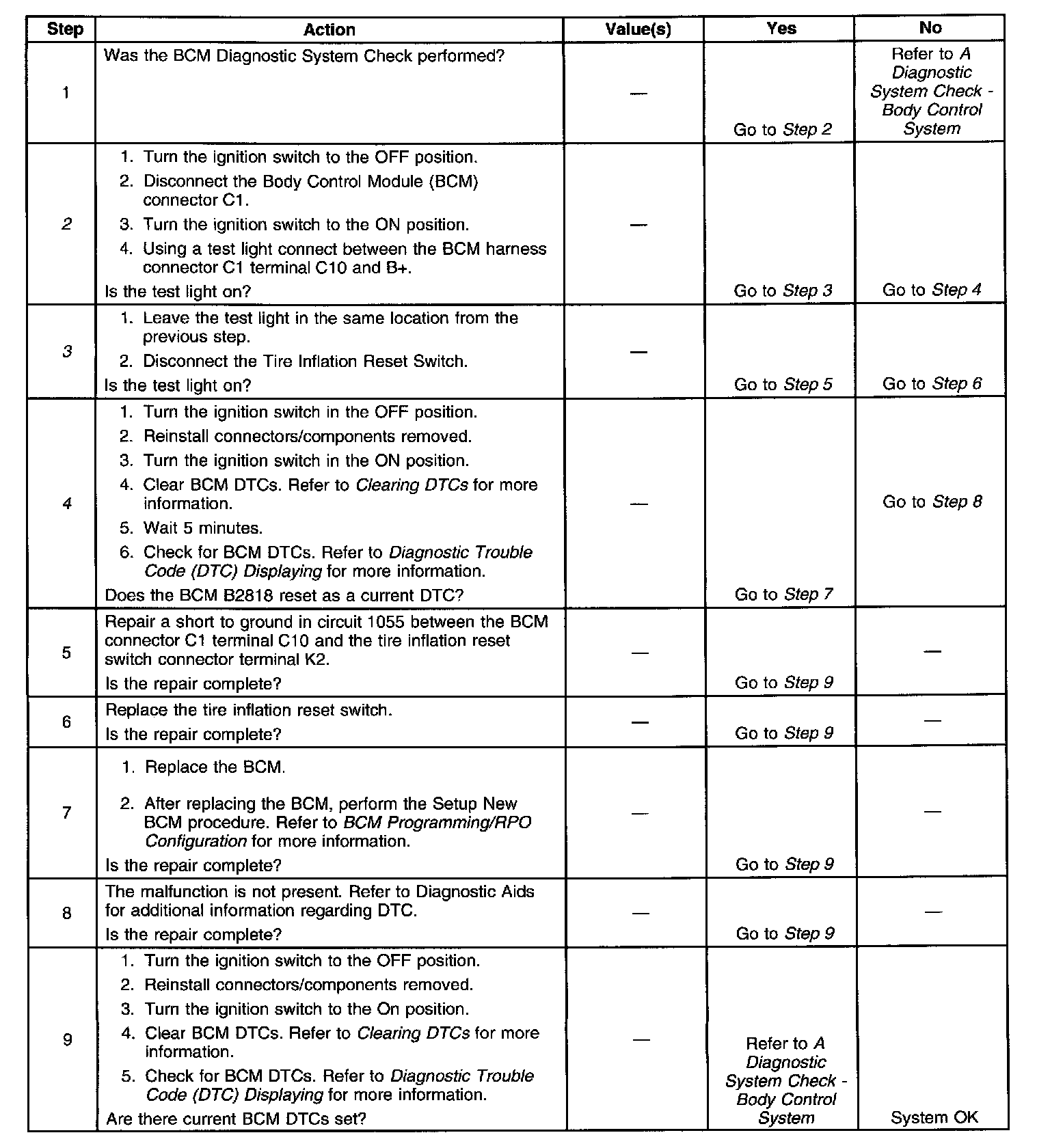 3. The step determines whether the short to ground is in circuit 1055 or the tire inflation reset switch.