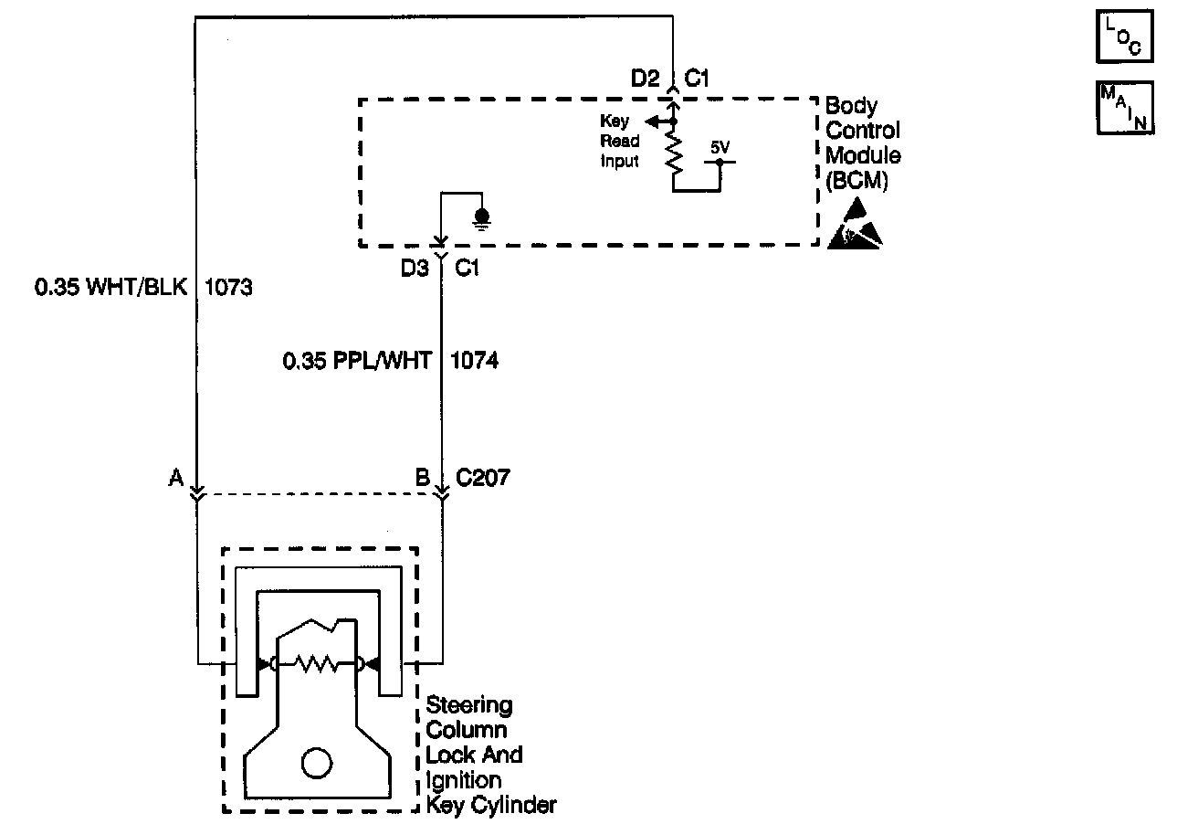 The ignition lock cylinder contains the resistor-sensing contacts. These contacts touch the resistor pellet that is embedded in the ignition key. When the ignition key is inserted in the ignition lock cylinder, the resistor pellet completes the key detection circuit (CKT 1073 and CKT 1074).