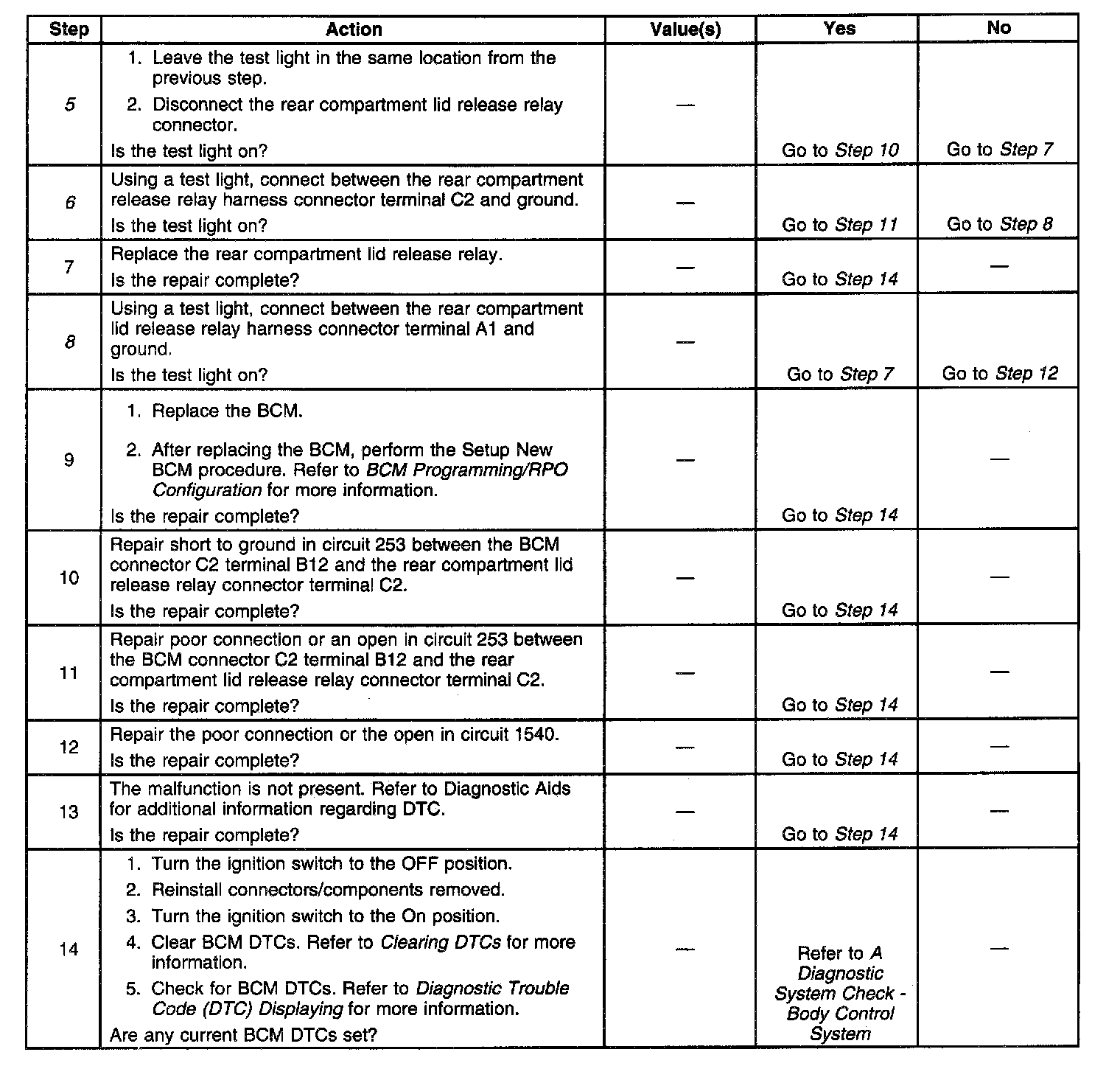 5. This step determines whether the short to ground is in circuit 253 or the rear compartment lid release relay is faulty.