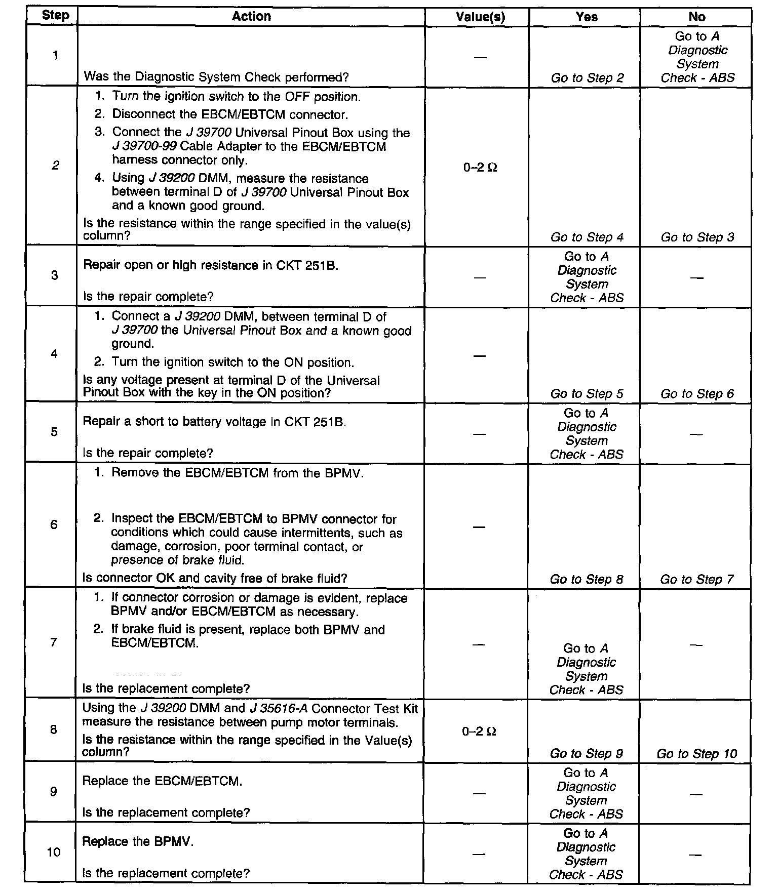 The pump motor is an integral part of the Brake Pressure Modulator Valve (BPMV). The electronic brake control relay supplies power to the solenoid valves and pump motor. The electronic brake control relay, located in the EBCM/EBTCM, is activated whenever the ignition switch is in the RUN position and no faults are present. The electronic brake control relay remains engaged until the ignition switch is turned off or a failure is detected.
