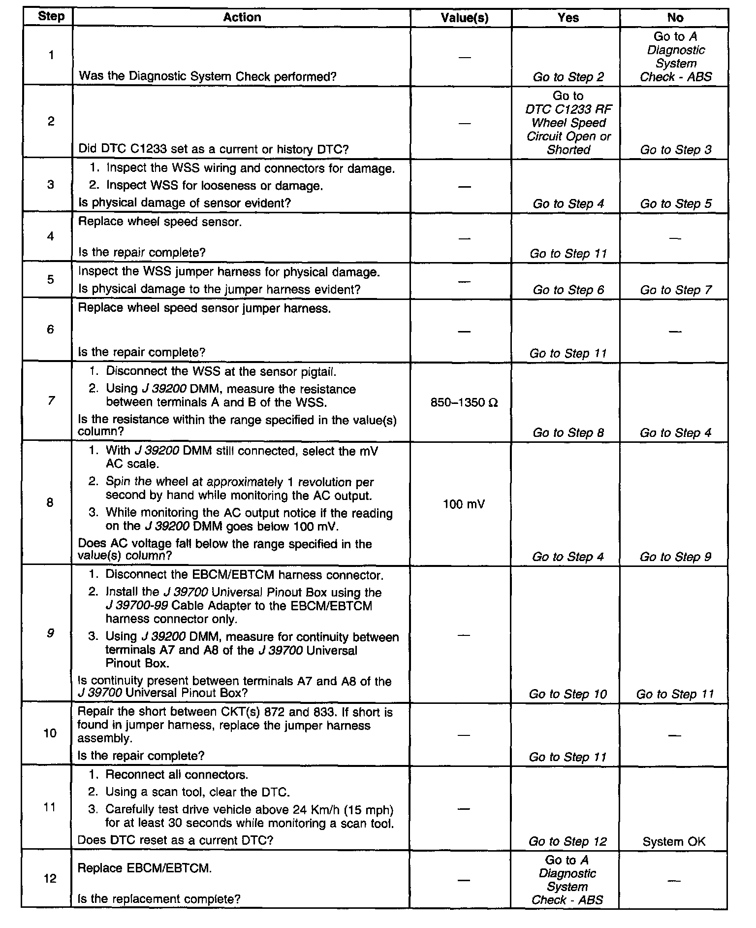 The DTC will set if the right front wheel speed = 0 and the other wheel speeds are greater than 8 Km/h (5 mph) for 2.5 seconds.