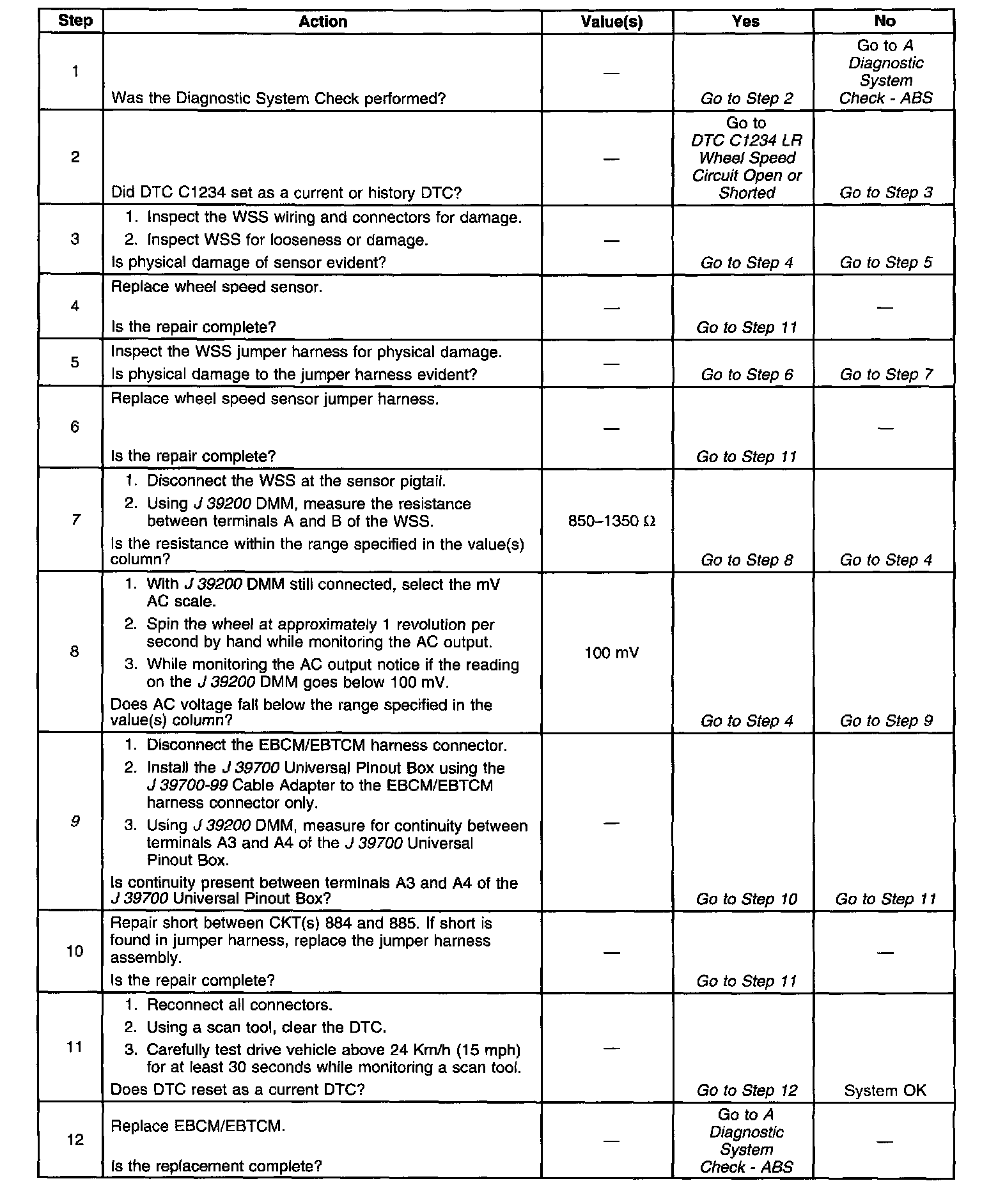 The DTC will set if the left rear wheel speed = 0 and the other wheel speeds are greater than 8 Km/h (5 mph) for 2.5 seconds.