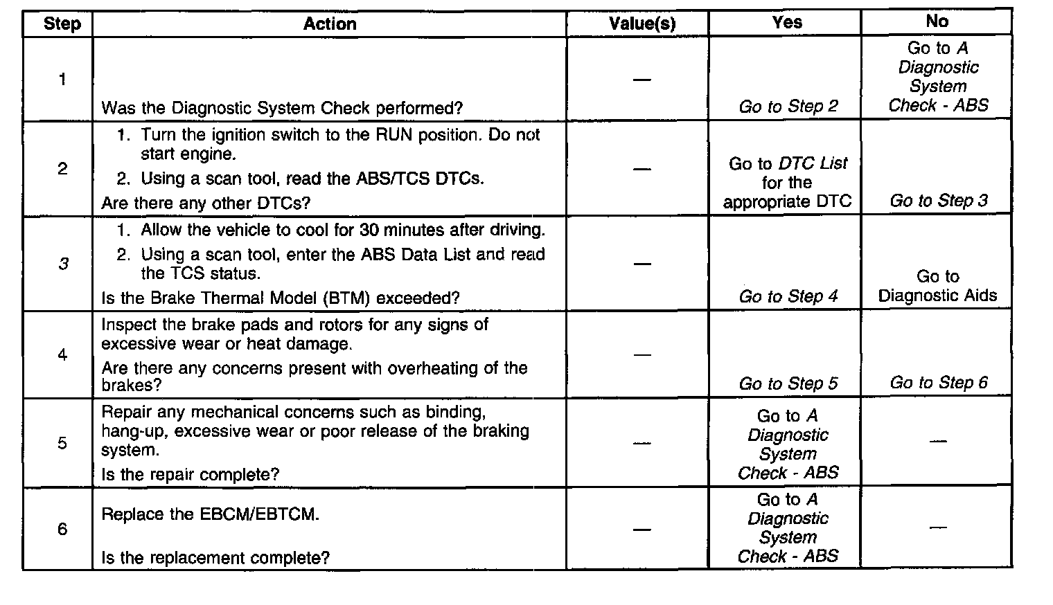 The EBTCM monitors vehicle speed deceleration and ABS/TCS activation to calculate brake rotor temperatures. When brake rotor temperatures are exceeded, TCS will be disabled, DTC C1238 is set, and the TRAC OFF indicator is turned ON. If the brake usage is reduced during driving, the brake rotor cooling is calculated and TCS will be enabled.
