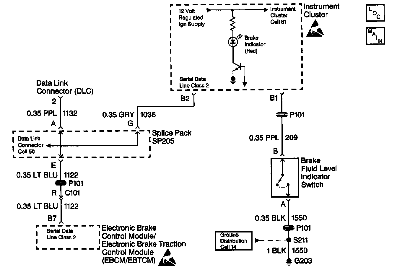 When the master cylinder is low on brake fluid the brake fluid level indicator switch grounds the circuit and turns on the RED brake indicator in the instrument cluster, then the instrument cluster sends a class 2 message to the EBTCM. If the low brake fluid message is sent from the IPC to the EBTCM, TCS will be disabled and a Diagnostic Trouble Code (DTC) will be set.