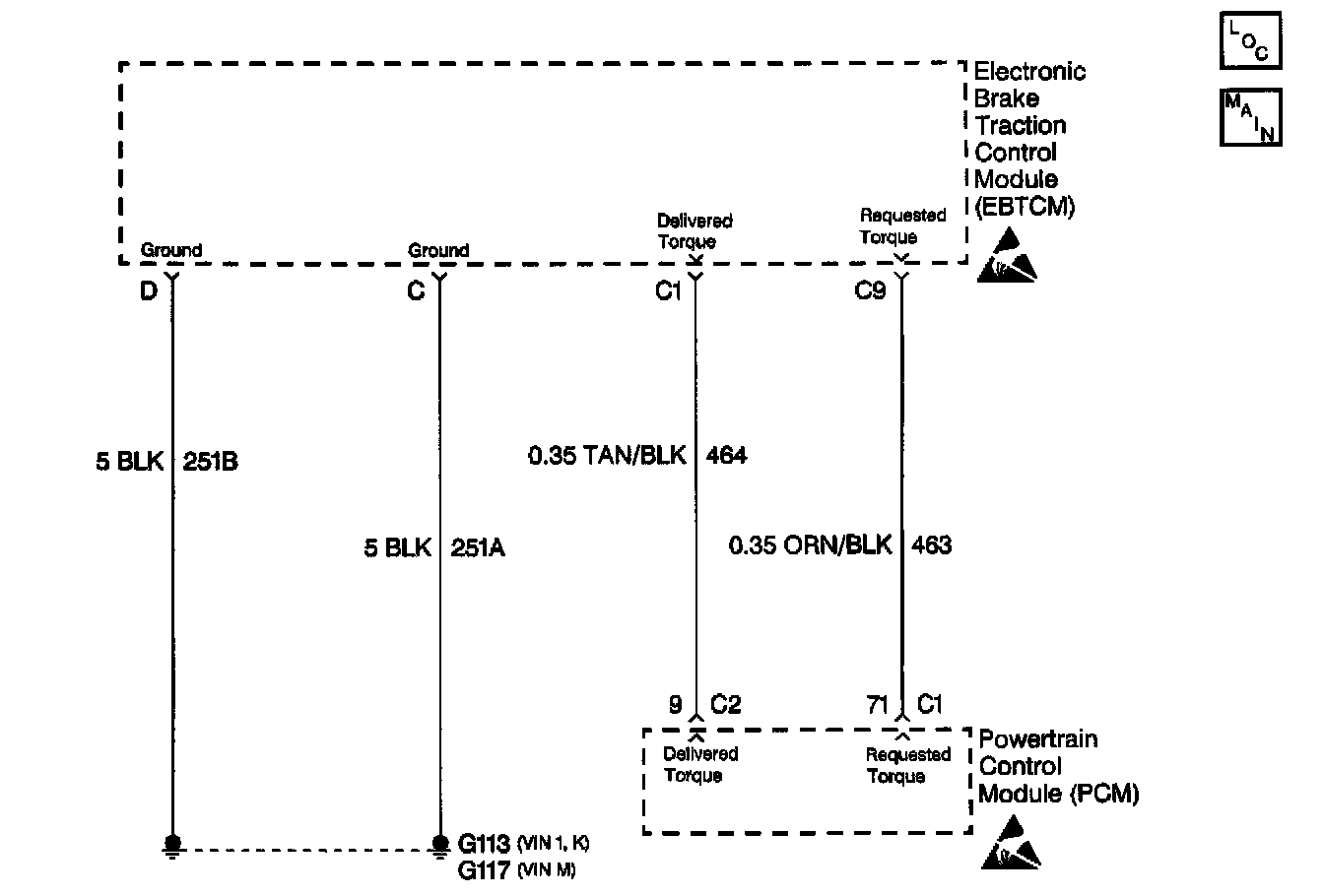 Traction Control is simultaneously controlled by the EBTCM and the Powertrain Control Module (PCM). The PCM sends a DELIVERED TORQUE message via a Pulse Width Modulated (PWM) signal to the EBTCM confirming the delivered torque level for proper Traction Control system operation. The EBTCM supplies the pull up voltage.