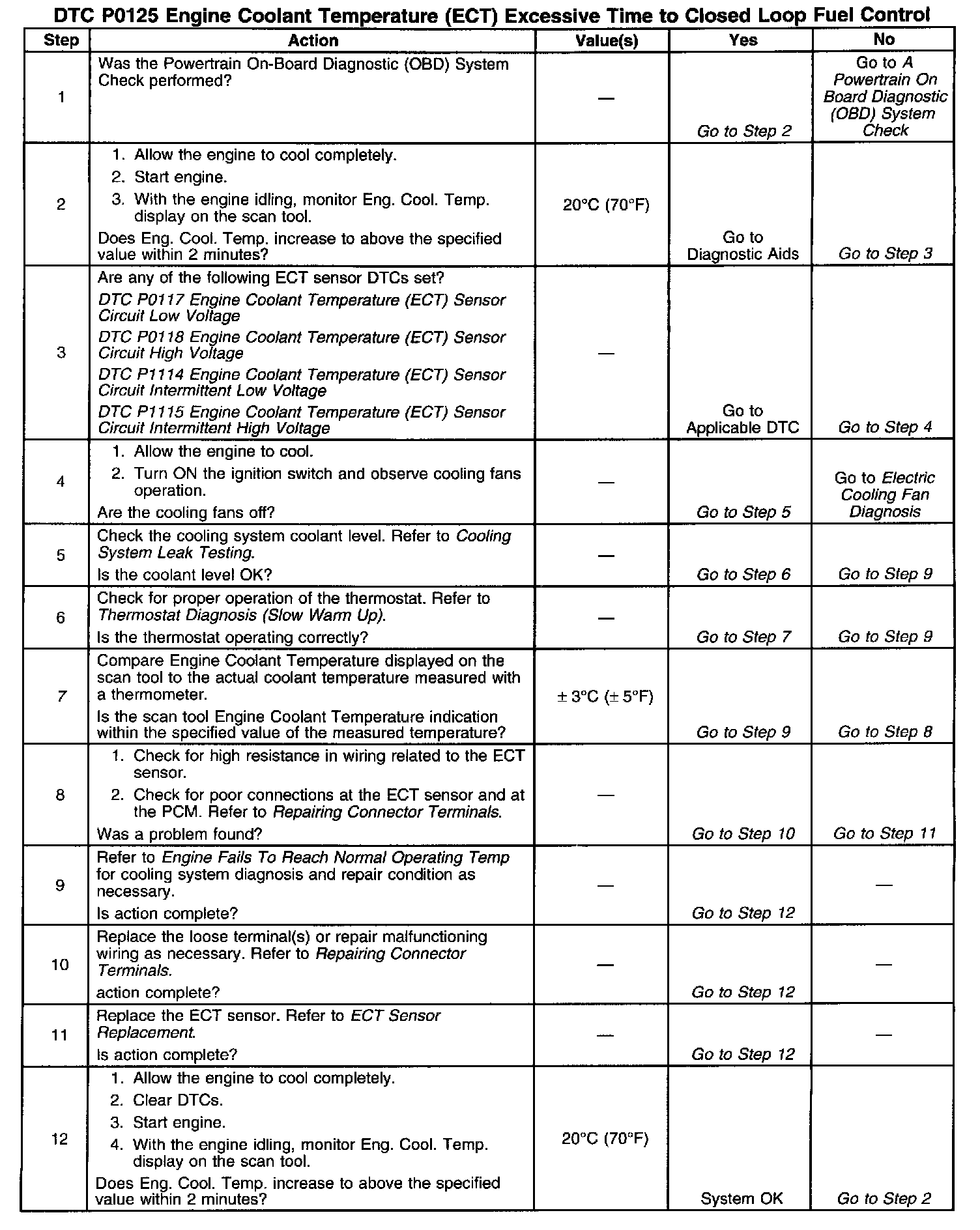 DTC P0125 set indicates a skewed ECT sensor. Comparing the engine coolant temperature displayed on a scan tool with actual coolant temperature measured with a thermometer may isolate this condition. If the displayed engine coolant temperature is not close to the actual coolant temperature, replace the ECT sensor.
